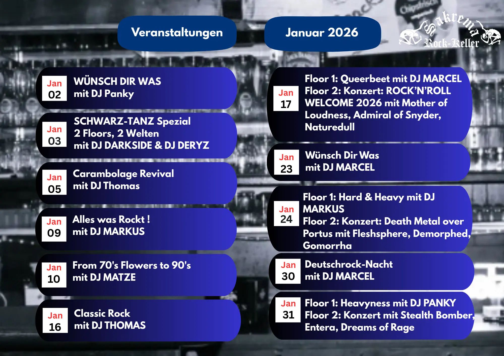 Hier findest du alle aktuellen Neuigkeiten, Highlights und einen Überblick über das, was dich bei uns erwartet. Bleib auf dem Laufenden und entdecke, warum der Rock-Keller Sakrema dein neuer Lieblingsort ist!