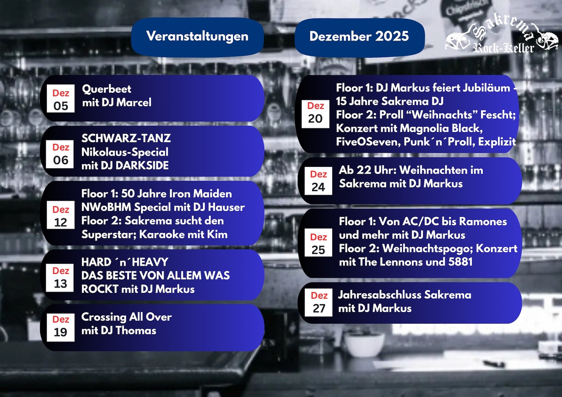 Hier findest du alle aktuellen Neuigkeiten, Highlights und einen Überblick über das, was dich bei uns erwartet. Bleib auf dem Laufenden und entdecke, warum der Rock-Keller Sakrema dein neuer Lieblingsort ist!